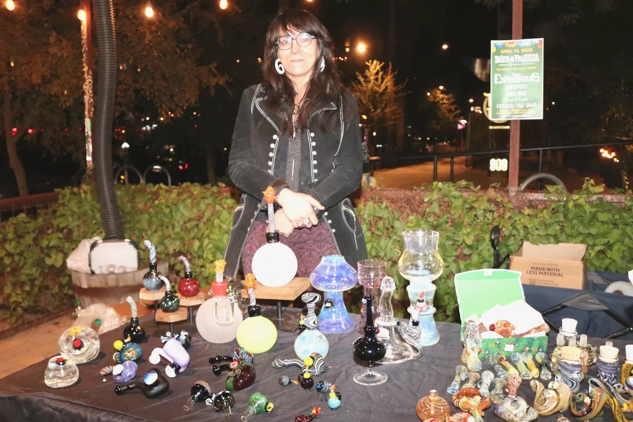 In front of the graffiti-painted house that is home to Bud’s, Mario was repping Sonoran Roots in Tempe and the Ponderosa Dispensary in Peoria. “[The event’s] not a market with your typical plastic bongs anymore,” he said. “It’s gotten more intricate, and it’s come a long way. One thing I like about certain glass blowers is they use opals, adding more energy to whatever you’re smoking.”
