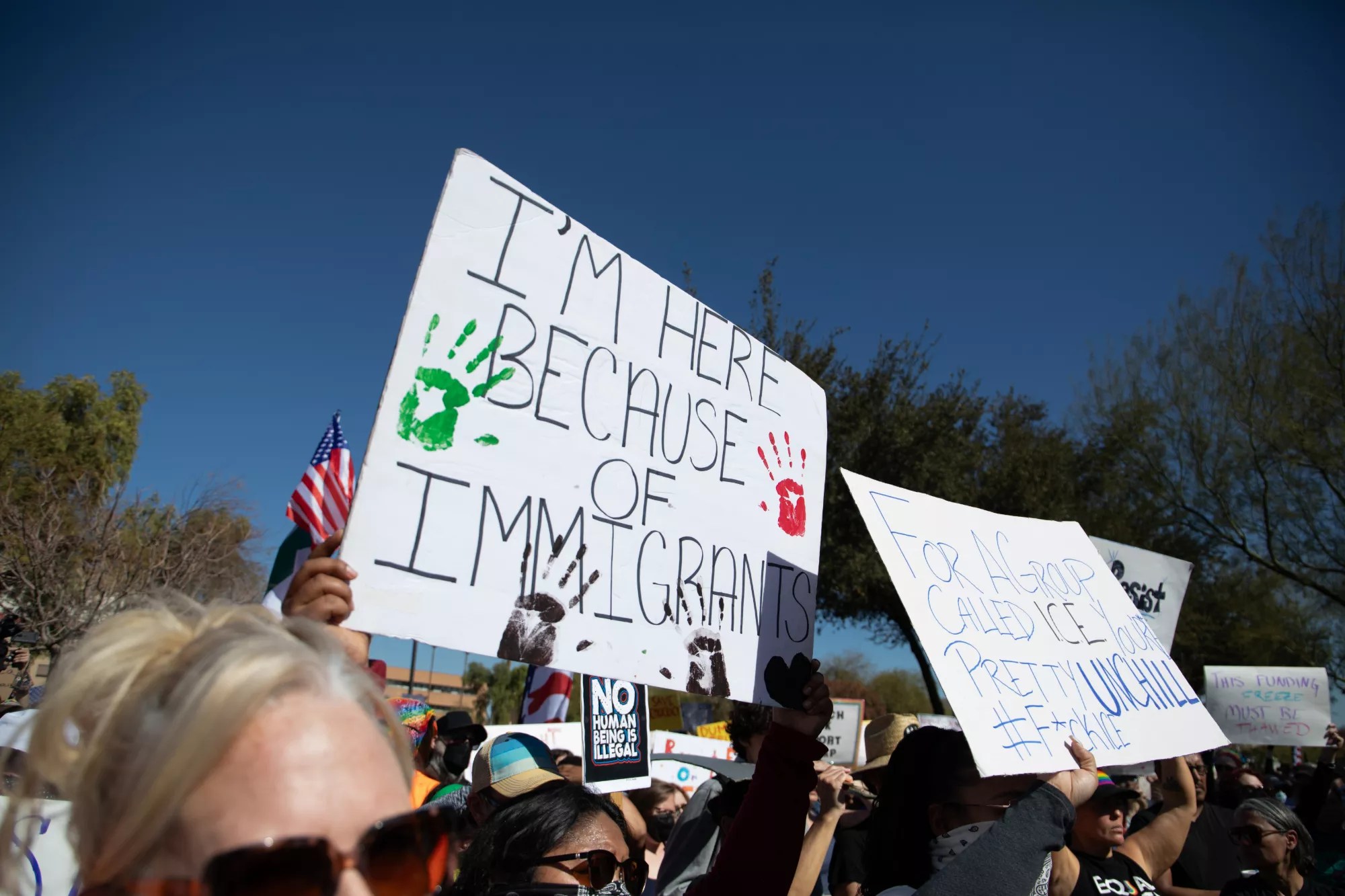 Arizona’s protestors were part of a national day of protests at the state capitols under the banner of 50501, a movement that called for direct action against the Trump administration on Wednesday. Redditors organized the nationwide protest; in Phoenix, the movement was grassroots. Individual organizers and organizations such as the Party for Socialism and Liberation Phoenix brought together protestors from across Phoenix’s Valley and the state – including Tucson, Tempe, Anthem, Payson and Sun City.
