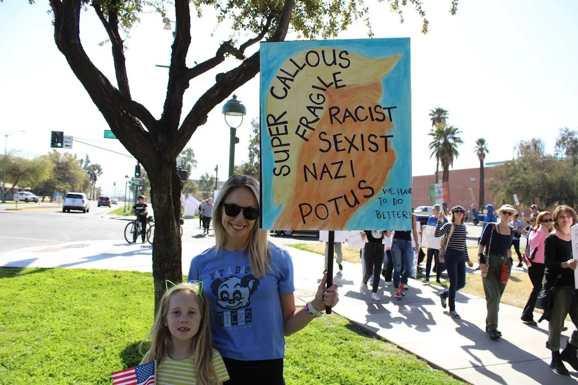Among the crowd was Jonna Alley, a Tucson mother marching alongside her 7-year-old daughter, Hannah. She held a sign with a marker-drawn image of Trump’s side profile with seven bolded words written across his face – SUPER CALLOUS FAGILE RACIST SEXIST NAZI POTUS – a parody of the quite atrocious “Mary Poppins” tune.