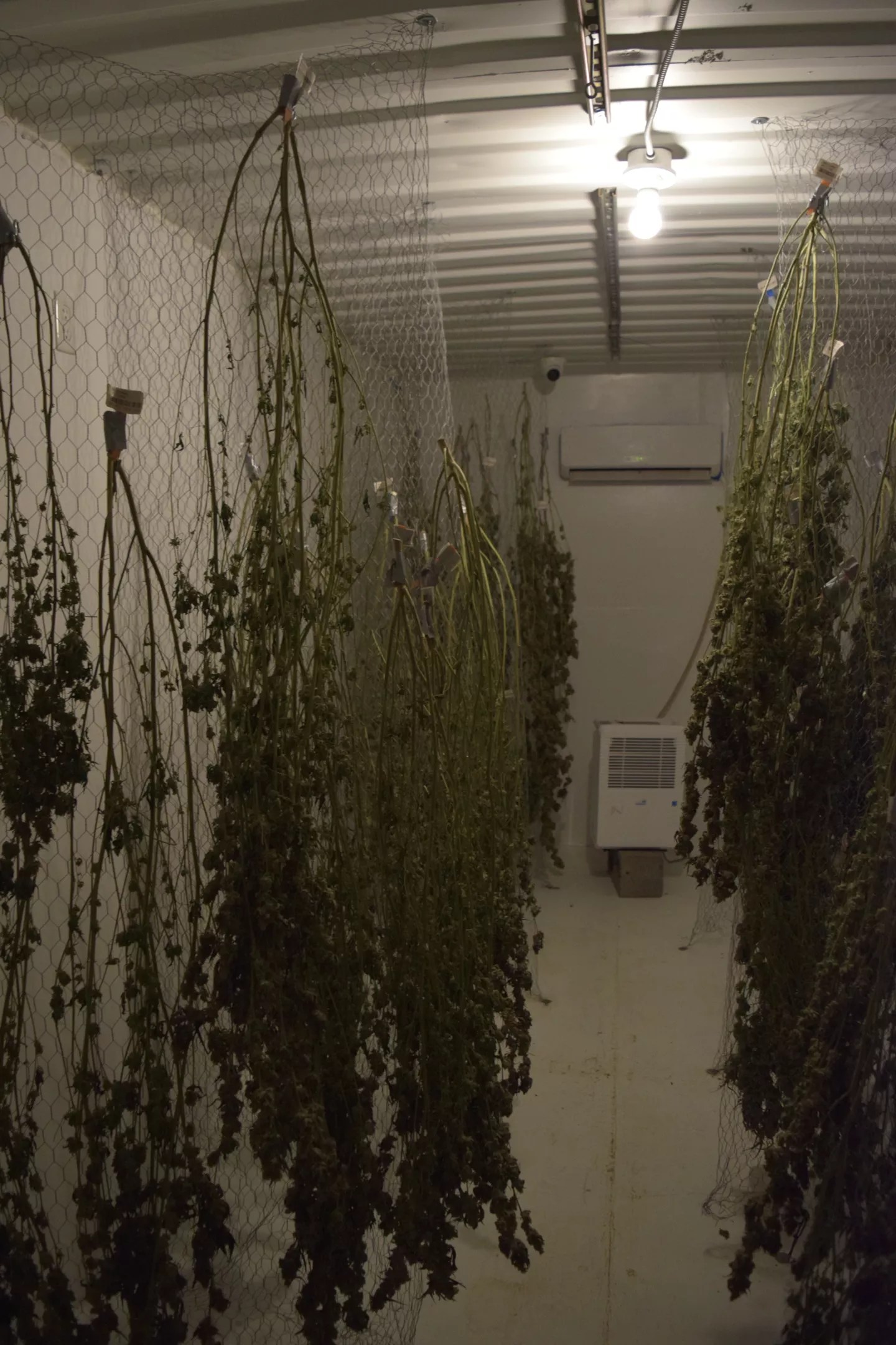 At one end of a hall are three shipping containers where the plants go to dry cure after they’re harvested. Branches from the plants hang upside-down from chicken wire, which is replaced every other month.