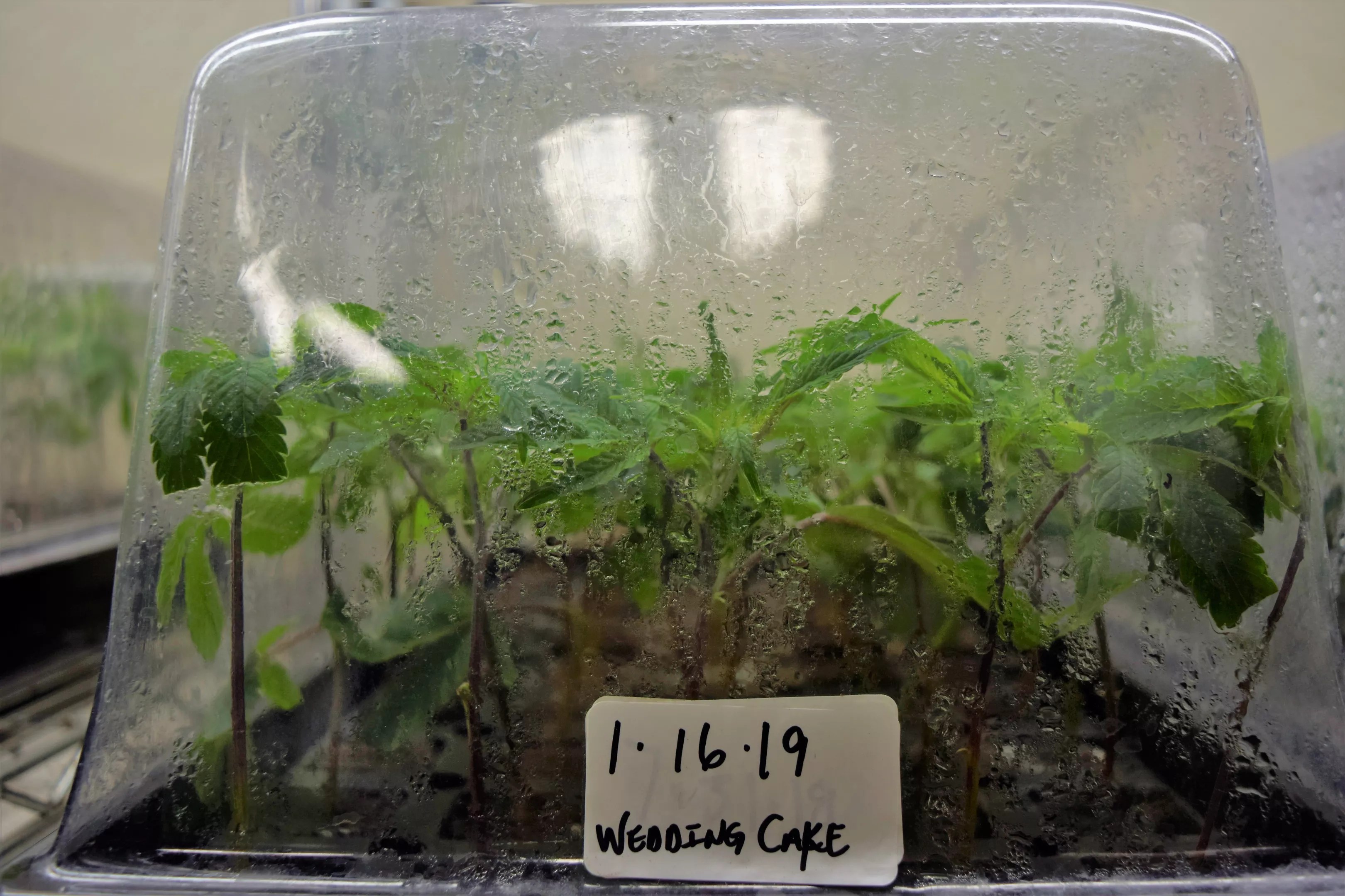 Freshly trimmed from the mother plant, baby cannabis plants take root inside mini-greenhouses.
