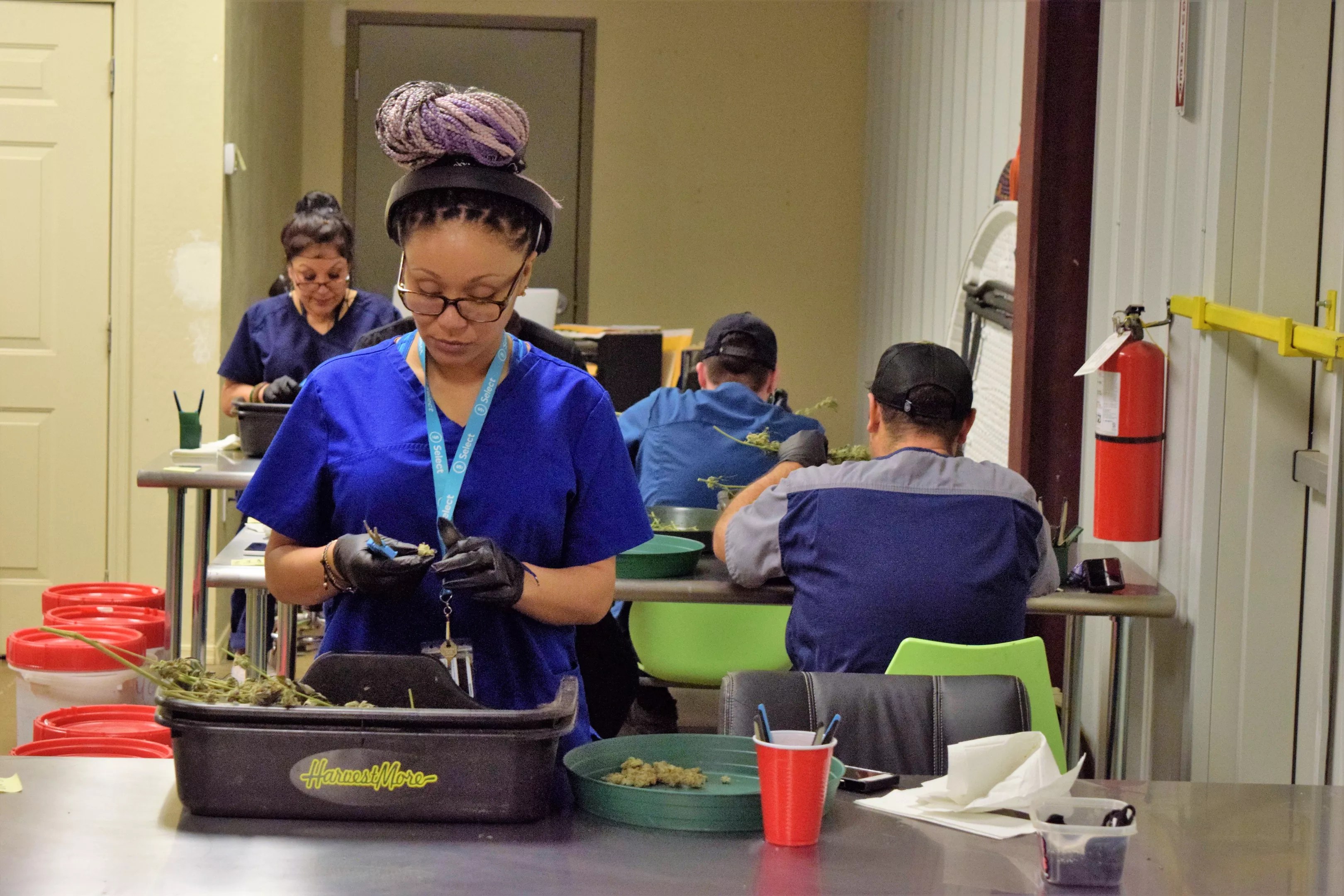 In one room near the front of the building, employees trimmed flower over stainless steel tables. Sticky notes at the end indicate which strain they’re working on: Blue Dream, Girl Scout Cookies or Jack Herer.