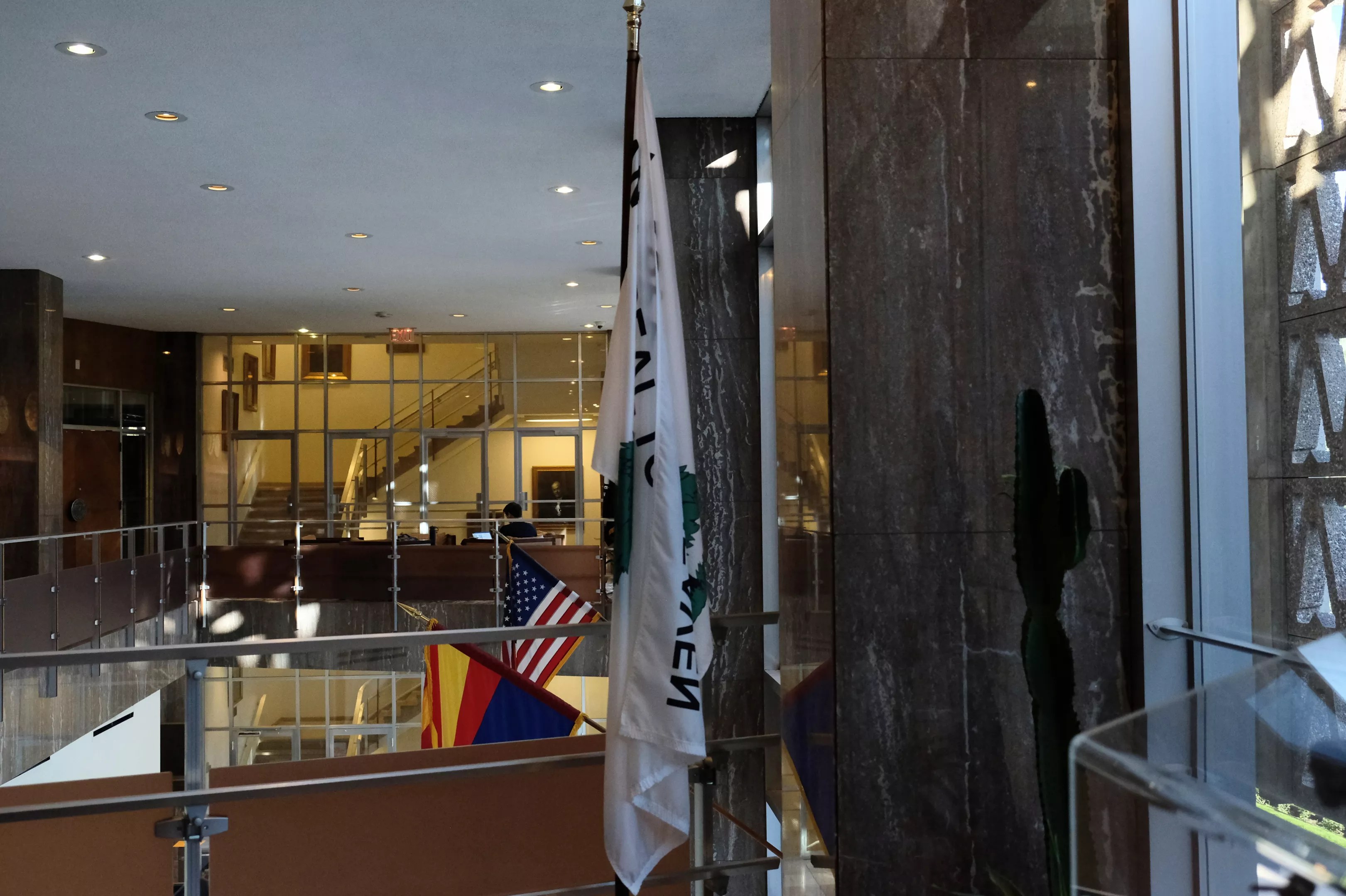 In the corner of the elegant public lobby of the Arizona House of Representatives building, a white flag with the symbol of a pine tree hangs.