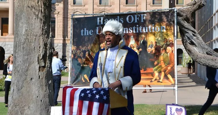 Arizona chapters of Indivisible, some dressed as historical figures, protested on the Arizona Capitol lawn asking legislators to keep their hands off the Constitution.