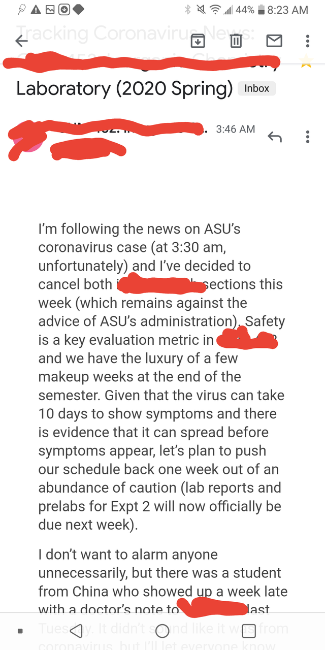 The screenshot of the email purportedly sent by an ASU professor states that the instructor has chosen to cancel two classes this week “out of an abundance of caution” and “against the advice of ASU’s administration.”