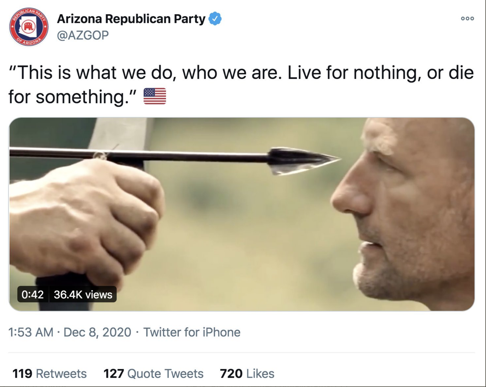 In another tweet posted a few hours later at 1:52 a.m. on Tuesday morning, the Arizona Republican Party included a Rambo movie clip with the quote, “This is what we do, this is who we are. Live for nothing, or die for something.” Screenshot