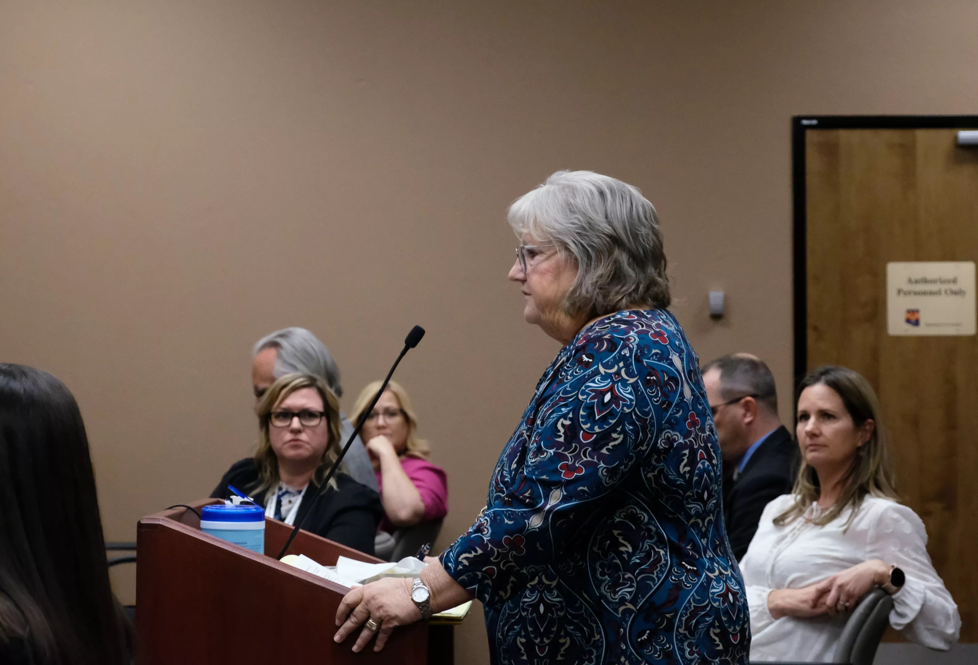 Leslie Bowdoin James, the sister of Deana Bowdoin, addresses the board.