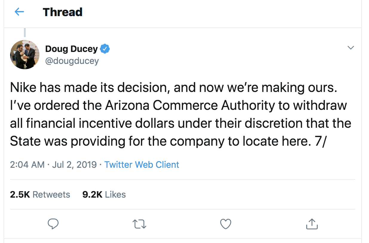 In a tweetstorm that began at 2 a.m. and concluded within six minutes, Ducey announced he’d ordered Arizona Commerce Authority to withdraw all state financial incentives for a new Nike multimillion-dollar manufacturing plant in Goodyear. The reason behind the decision? Nike’s decision to pull a pair of shoes featuring an early American flag.