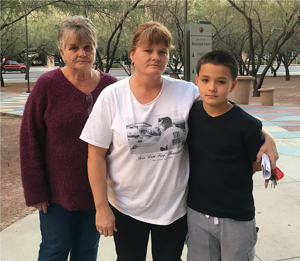 Hernandez’s family outside Phoenix municipal court: (From left) Deborah Murdoch, Hernandez’s grandmother; his mother, Christina Chicharello; and his brother Silas.