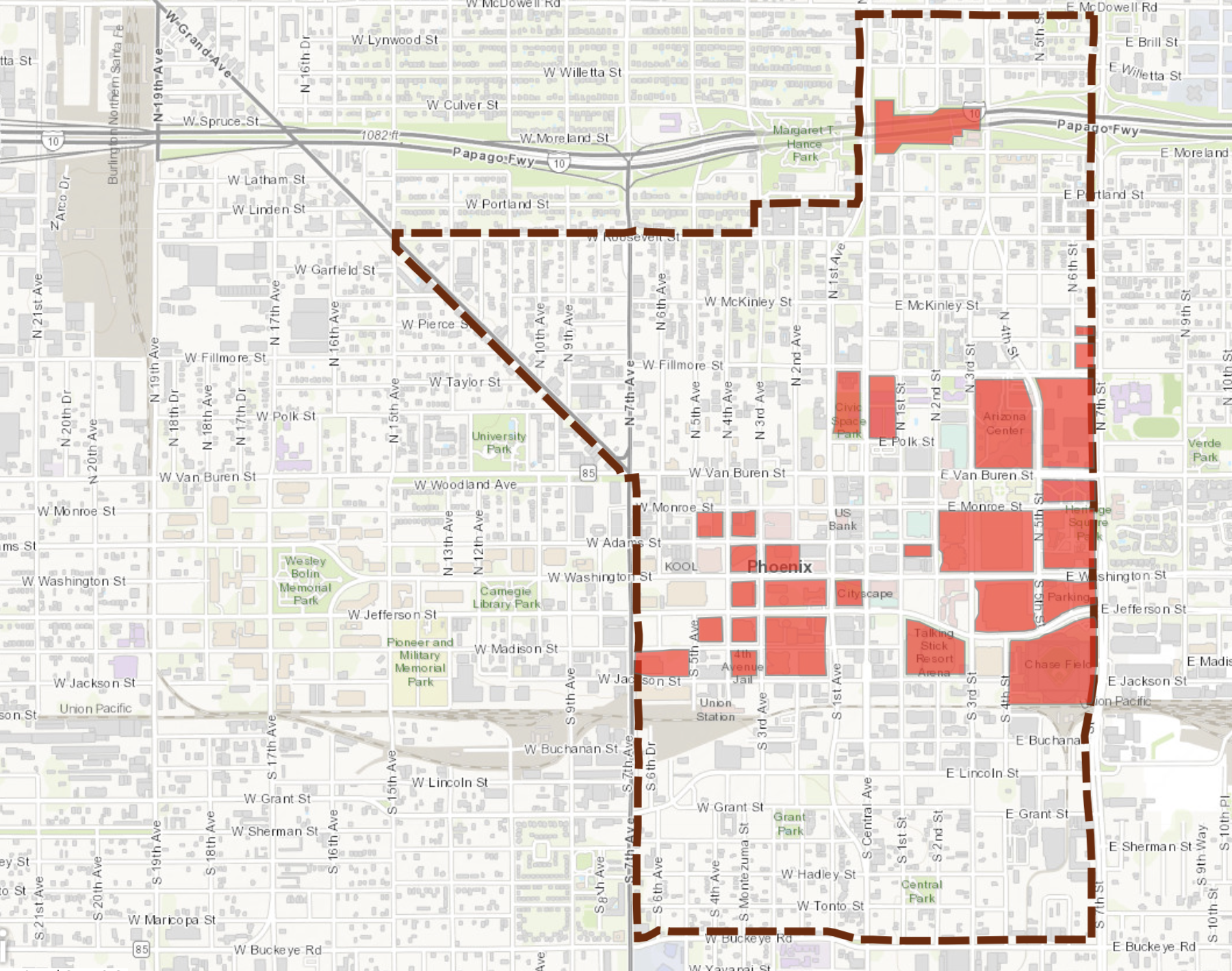 Parts of downtown only. Here’s a map (red areas, such as Arizona State University property, are scooter-restricted):