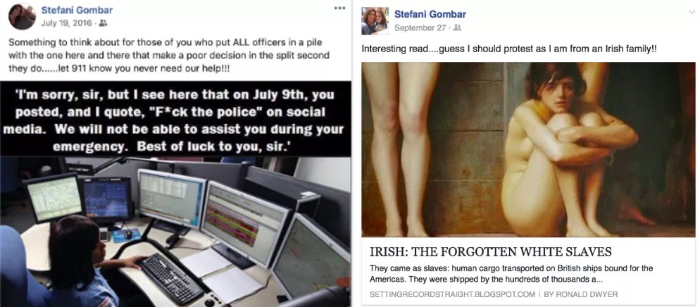 “Something to think about for those of you who put ALL officers in a pile,” wrote Gombar-McMichael alongside a post of a 911 dispatcher refusing to help someone in an emergency because that person had once criticized the police. “Interesting read…guess I should protest!” she wrote in another post linking to a story (which isn’t true or accurate) about “The Forgotten White Slaves.”