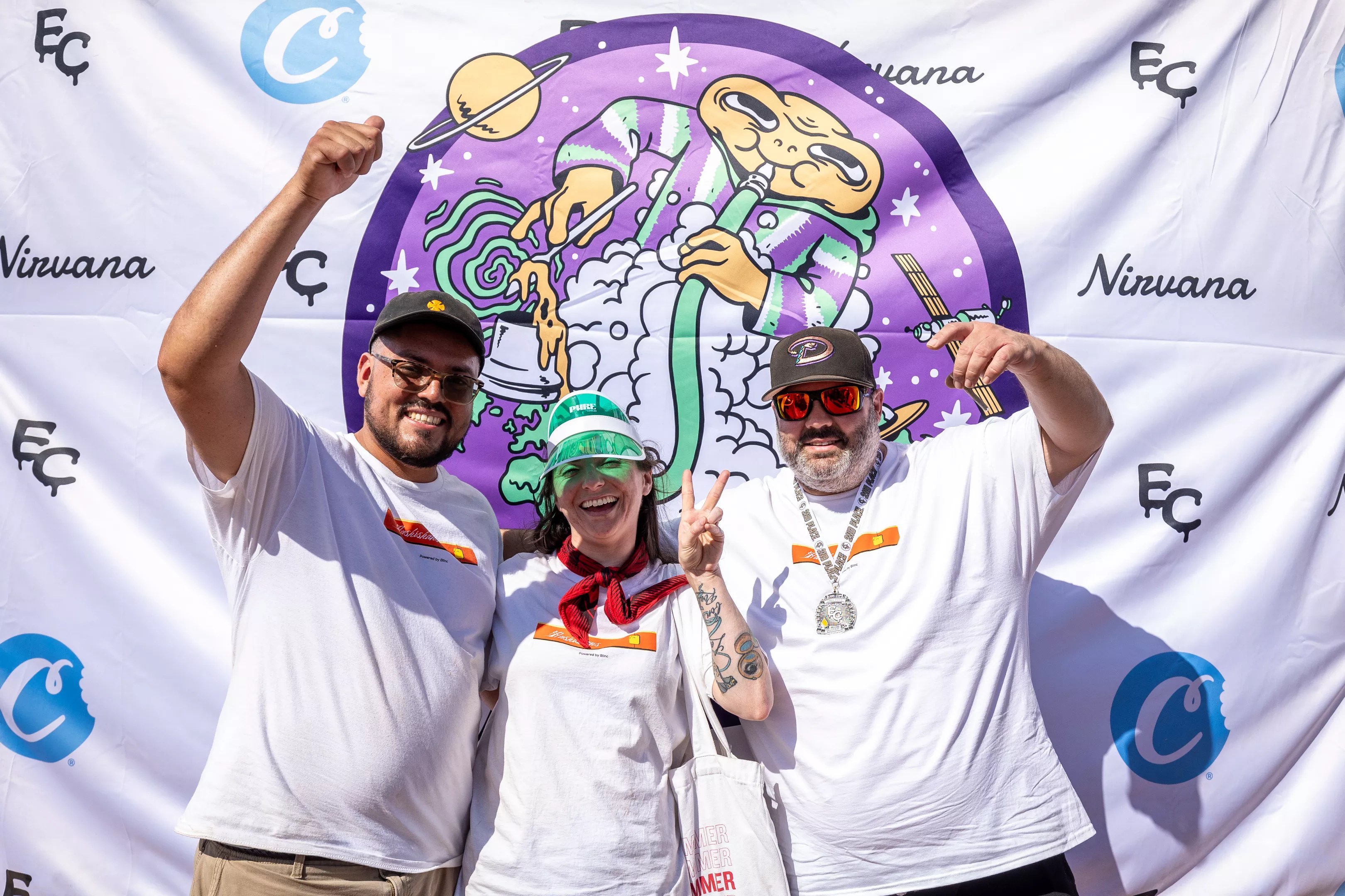 Erik Mendoza, Allison Rain and Chris Schaaff of Hashishans took second place for best sativa concentrate and celebrated in front of the Errl Cup banner.