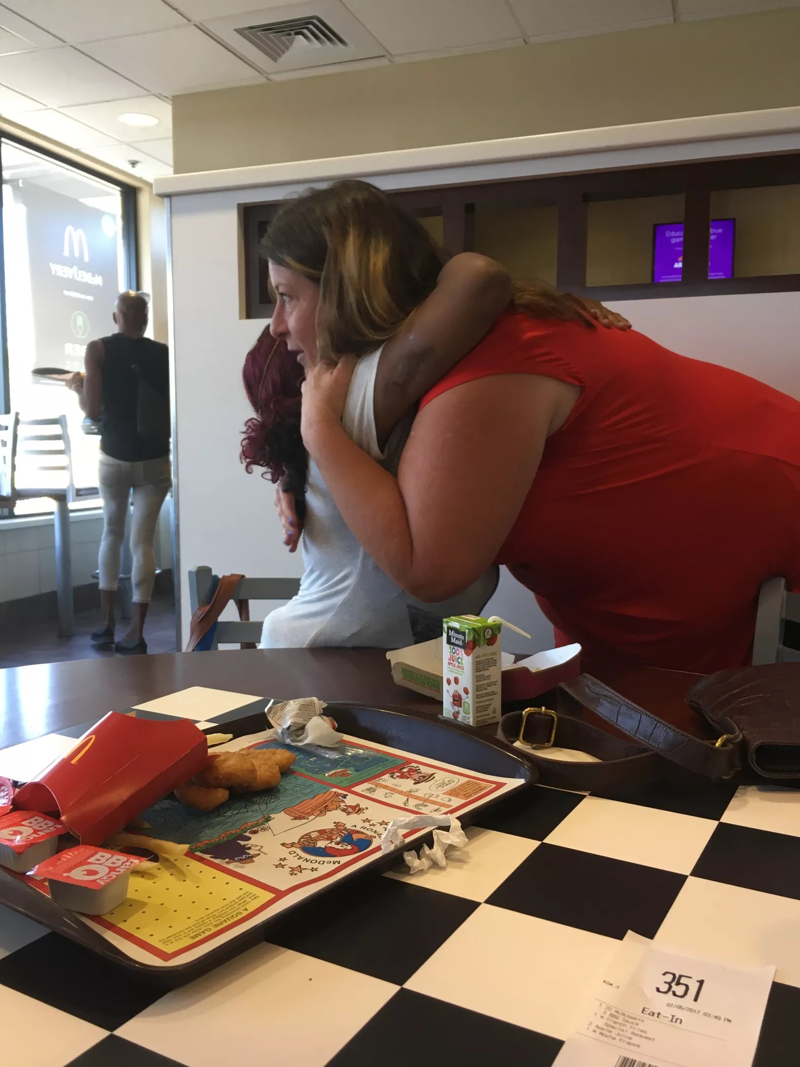 Wendy Garcia leans in to hug Brianna Huey as they talk about how health care impacts their children.