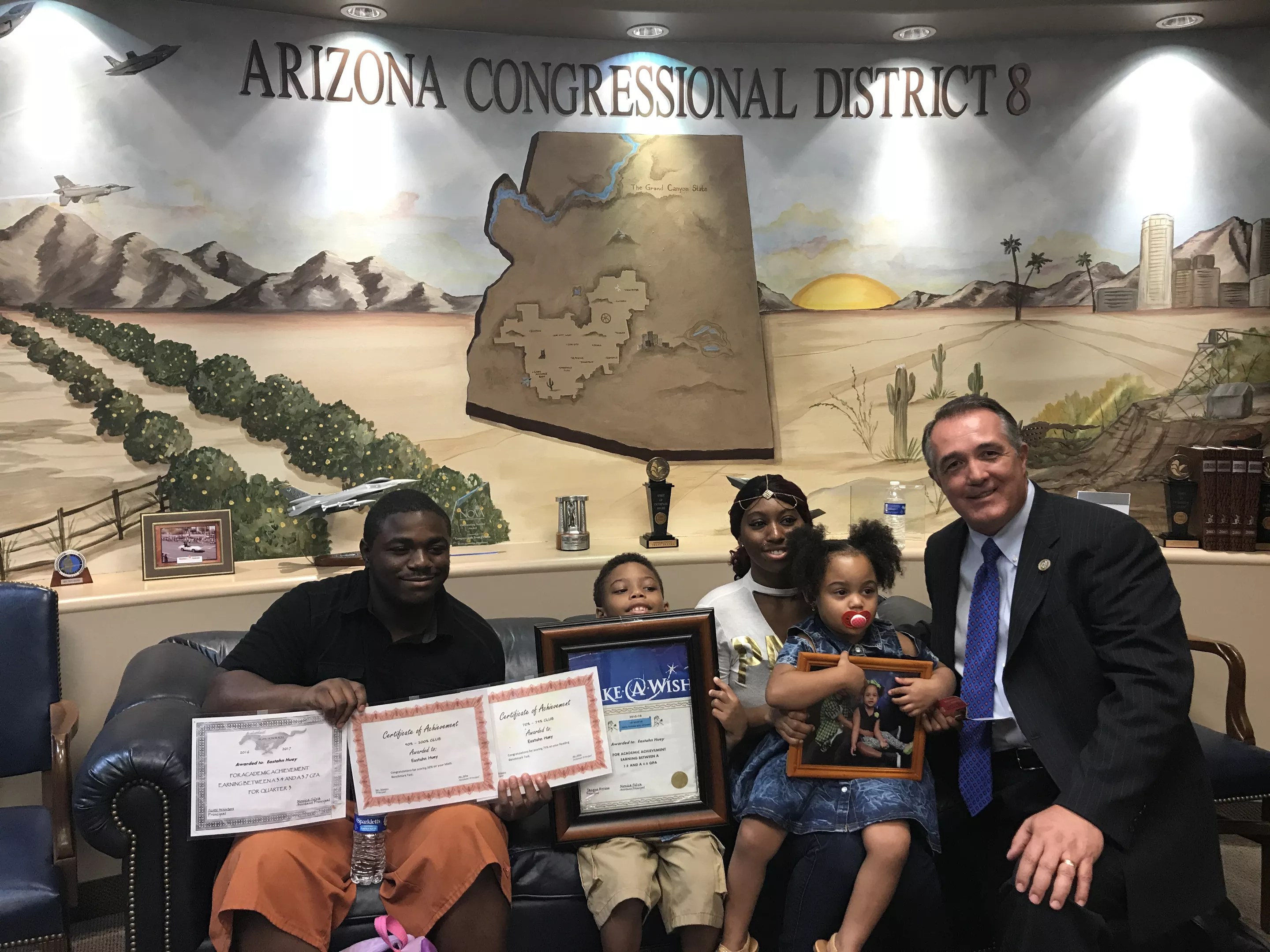 Brianna Huey and her boyfriend, Malcom Williams, and Huey's two children, Eastahn and Melianna, pose with Representative Trent Franks at his congressional office. The Huey family relies on health care coverage from the government and urged Franks to not support the Senate bill.