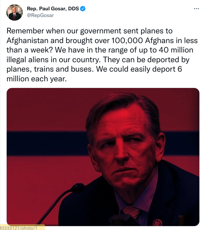 The post shows Gosar’s face with a dark red filter. The text reads: “Remember when our government sent planes to Afghanistan and brought over 100,000 Afghans in less than a week? We have in the range of up to 40 million illegal aliens in our country. They can be deported by planes, trains and buses. We could easily deport 6 million each year.”