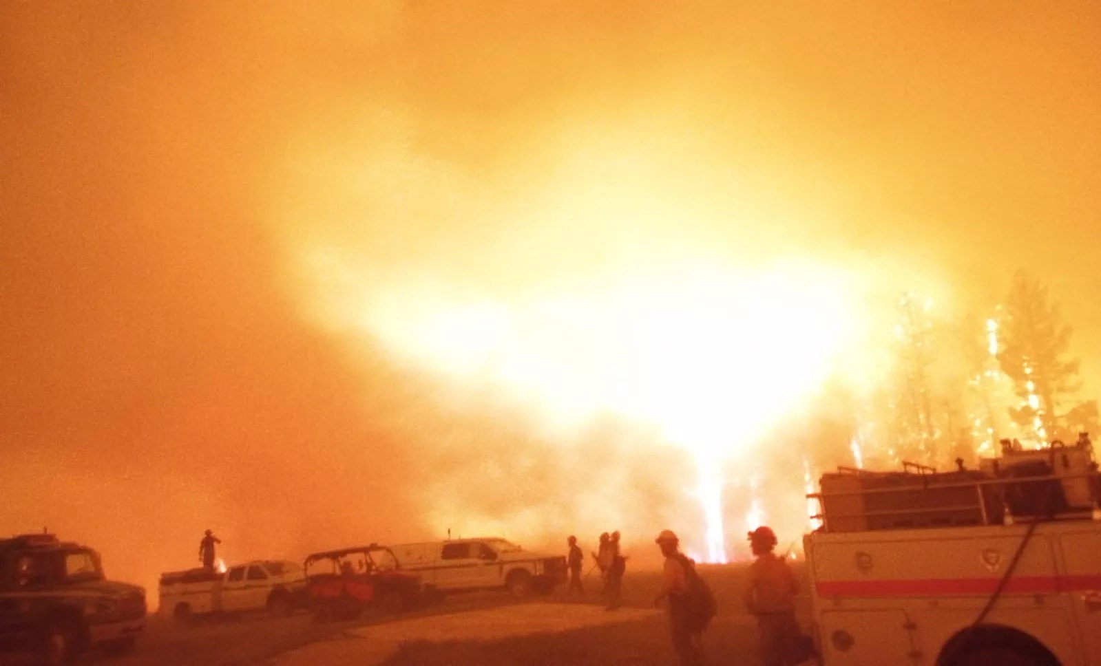 Firefighters and emergency vehicles are positioned in front of the Dragon Bravo Fire, with intense flames and thick smoke at Grand Canyon National Park on July 10.