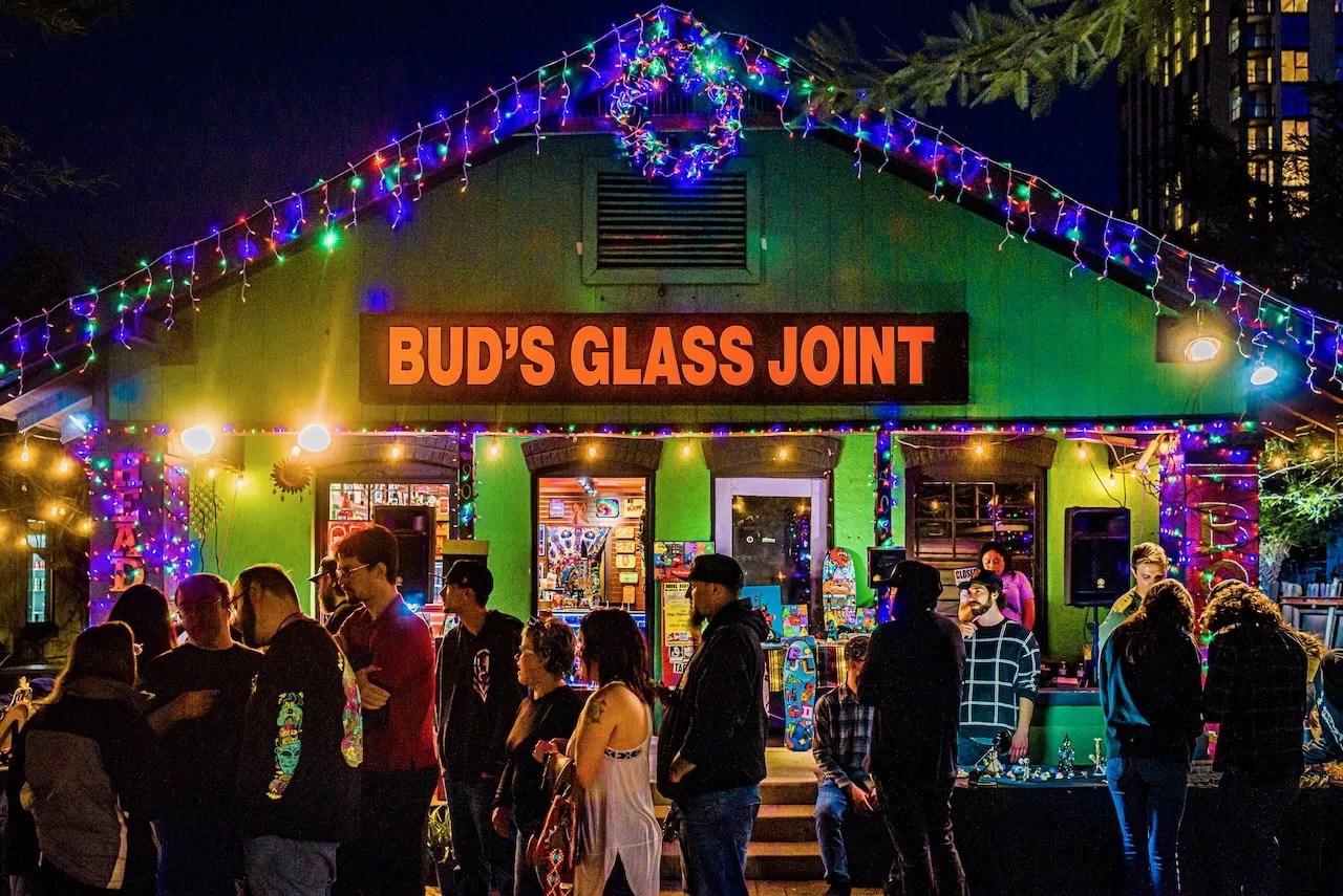 Bud Meister, a co-owner of Bud’s Glass Joint, poses for a photo in front of his Roosevelt Row store.