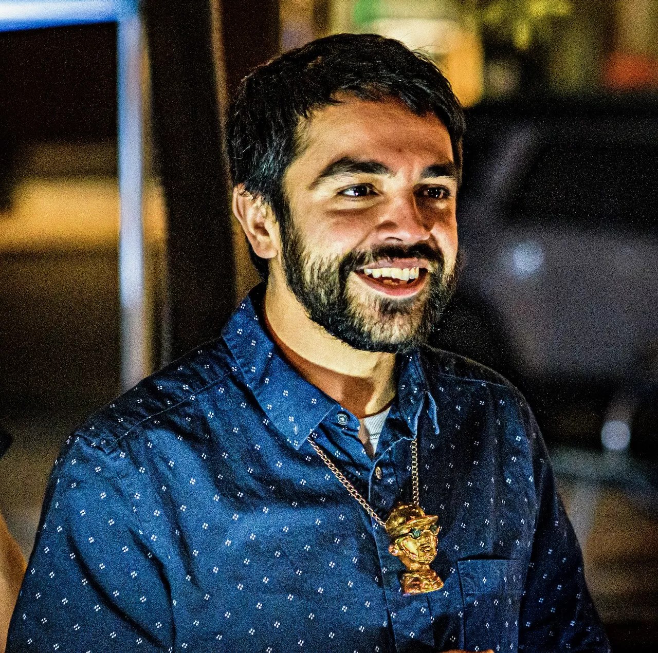 Luis Campos of Ironik Glass poses with his glasswork for sale.