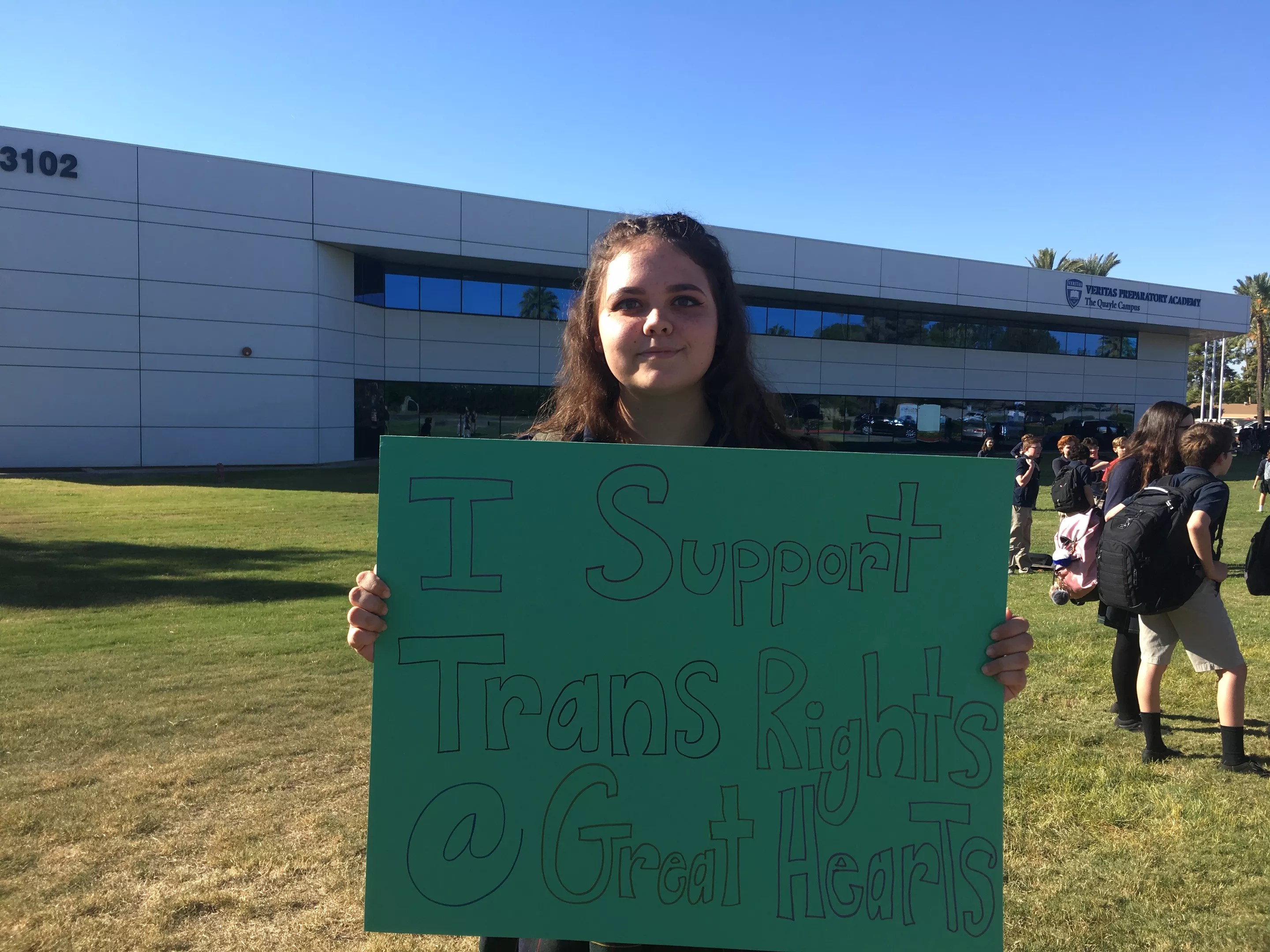 Elena Conklin, a sophomore at Veritas, proudly stood with a sign that read, “I Support Trans Rights @ Great Hearts.”