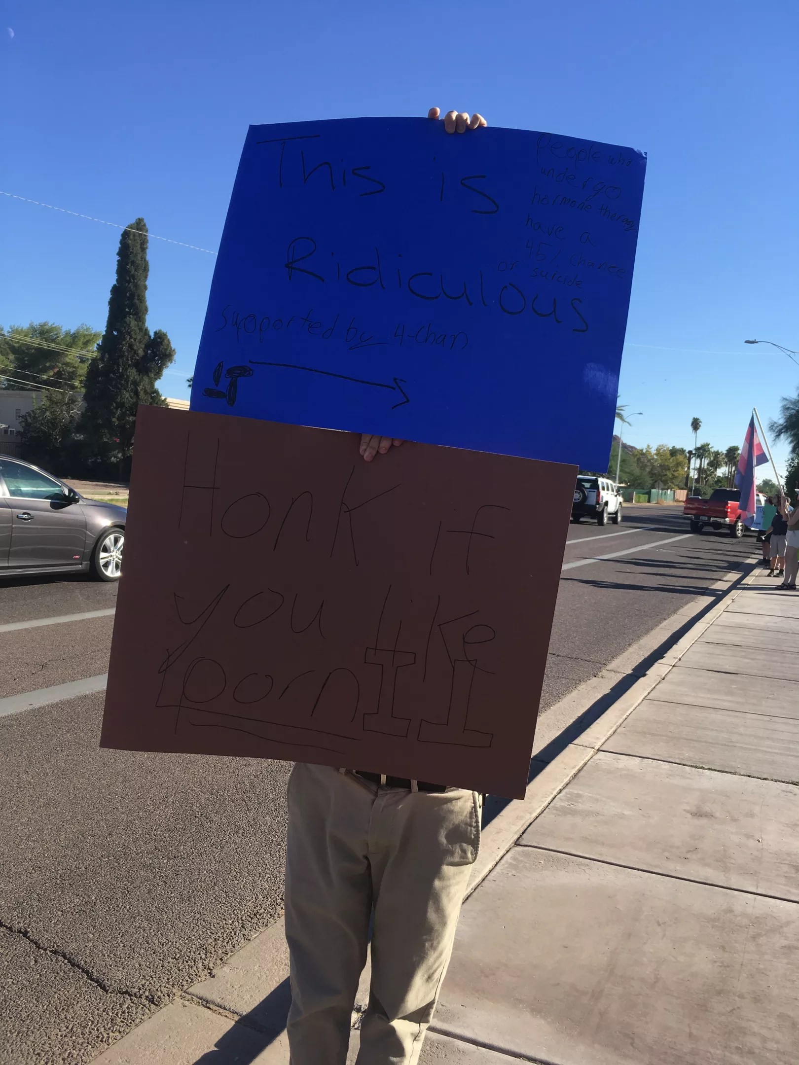 One boy borrowed a protester’s sign that read “This is ridiculous” and added “People who undergo hormone therapy have a 45% chance of suicide” in small black lettering.