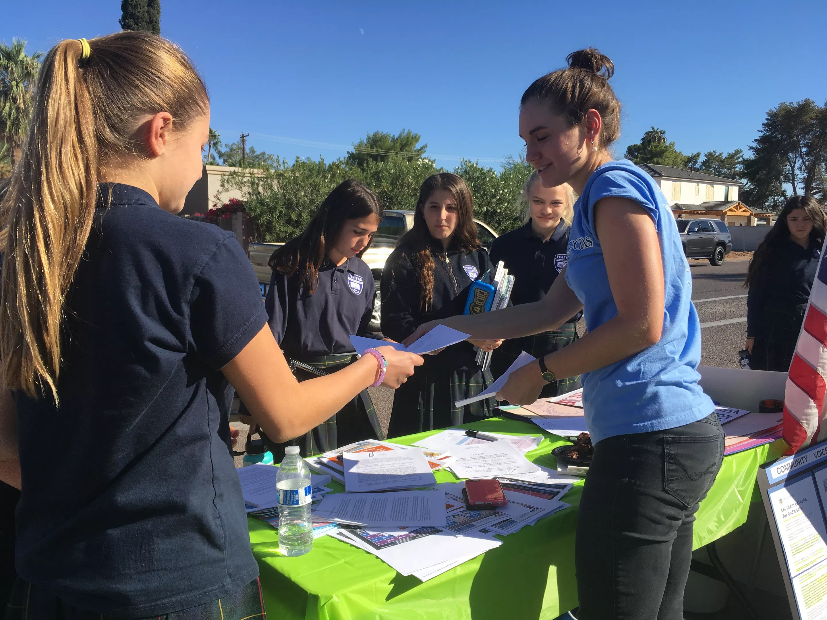About 20 protesters just outside of Great Hearts Veritas Preparatory Academy in Phoenix were swarmed Friday afternoon by a politically diverse group of teen students.