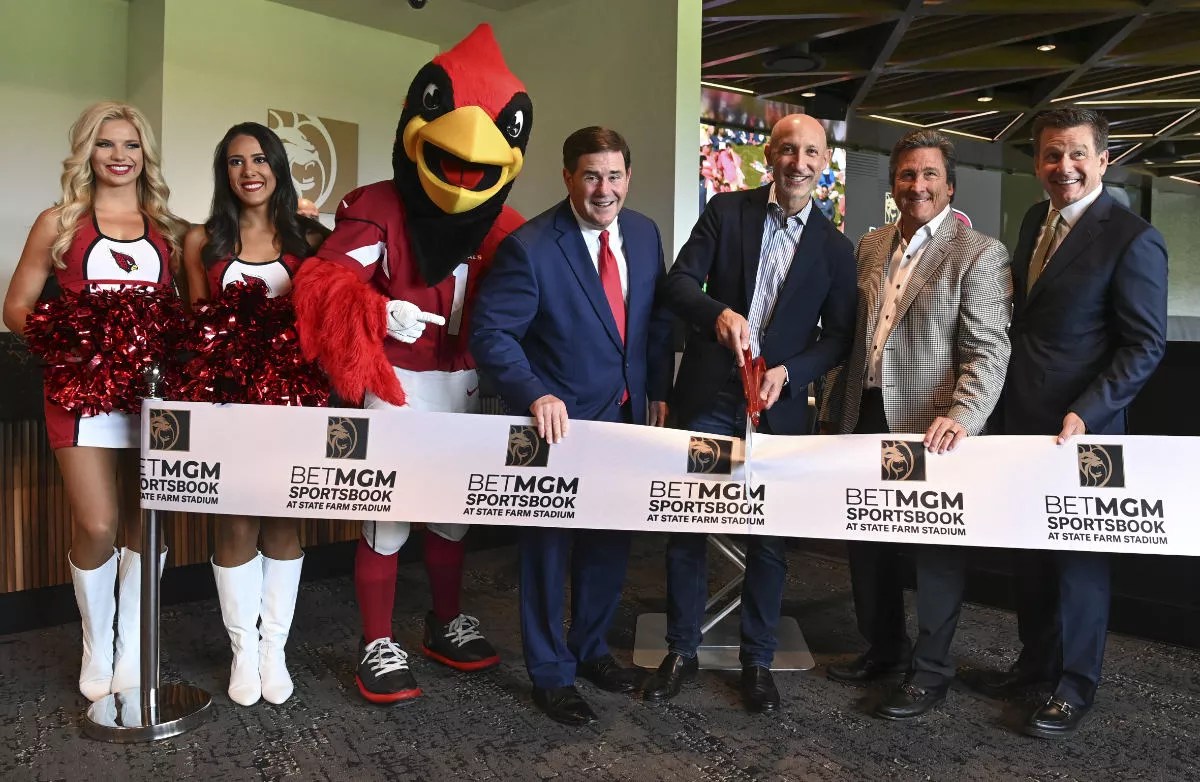 Flanked by Ducey and mascot Big Red, the Cardinals and BetMGM made history on the first day of the NFL season – and 364 days after sports betting went live in Arizona. Dignitaries debuted the first sportsbook at an NFL stadium with a ribbon-cutting event at State Farm Stadium in Glendale on September 8.
