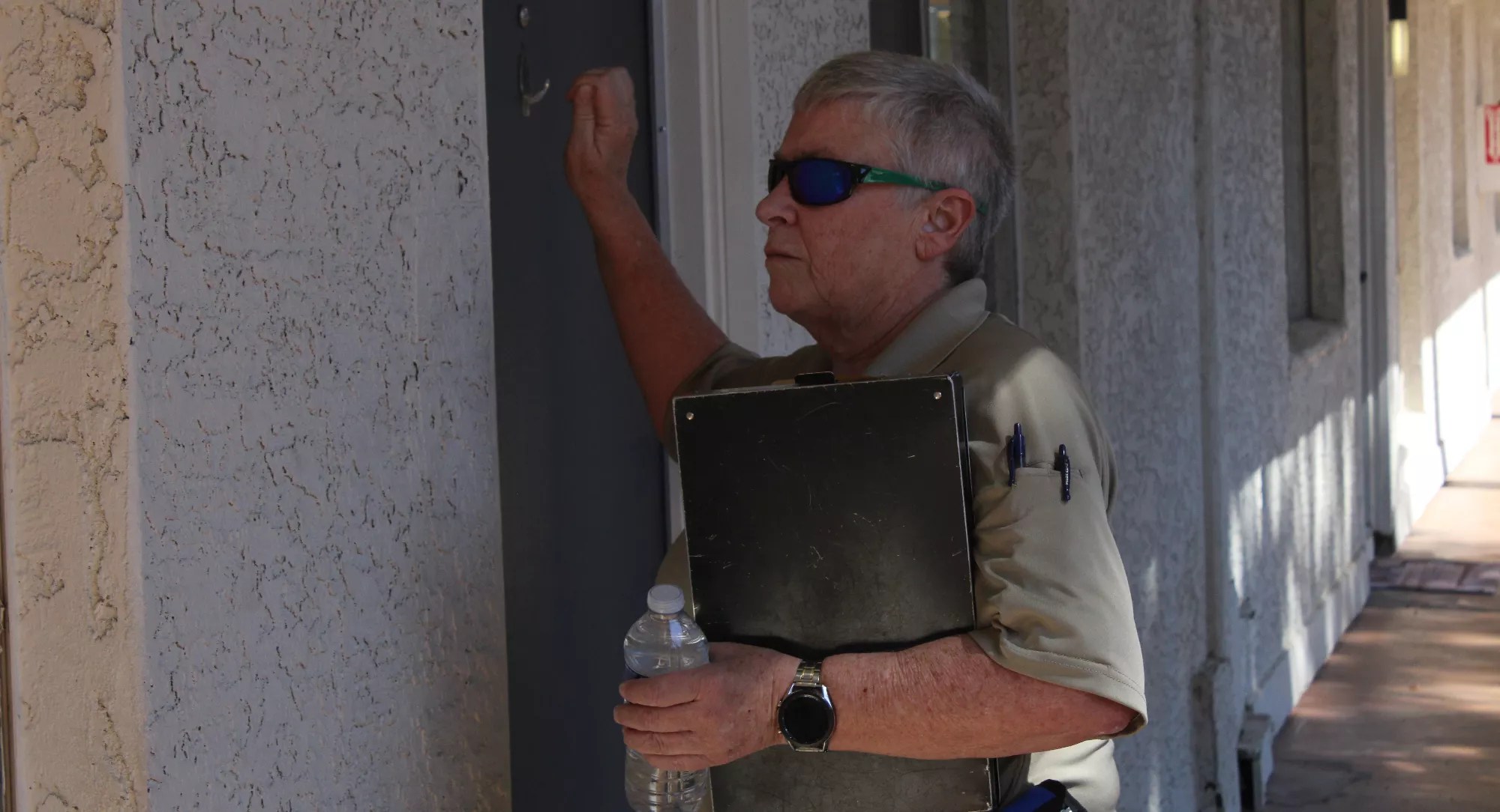 Maricopa County constable Karyn Lathan knocks on the door of a tenant she has evict.