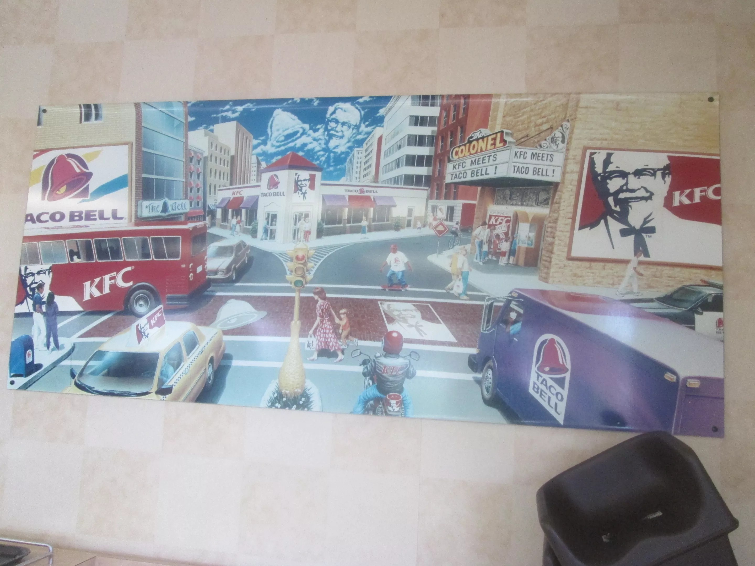 Another version of the mural can be found at a KFC-Taco Bell in Lakewood, New York. It depicts an anonymous city that’s been taken over by fast-food franchises – just about everything is emblazoned with KFC and Taco Bell logos, from the crosswalk to the mailbox to the clouds in the sky.