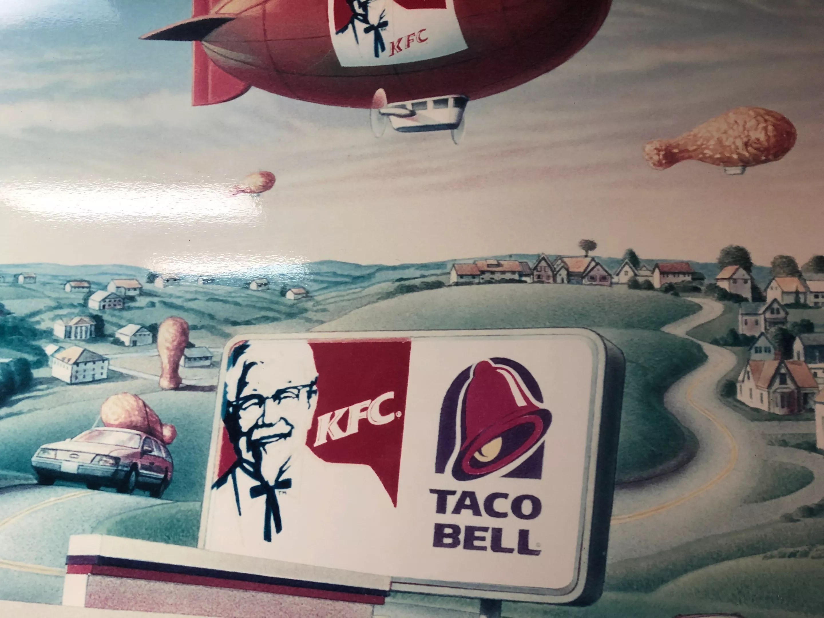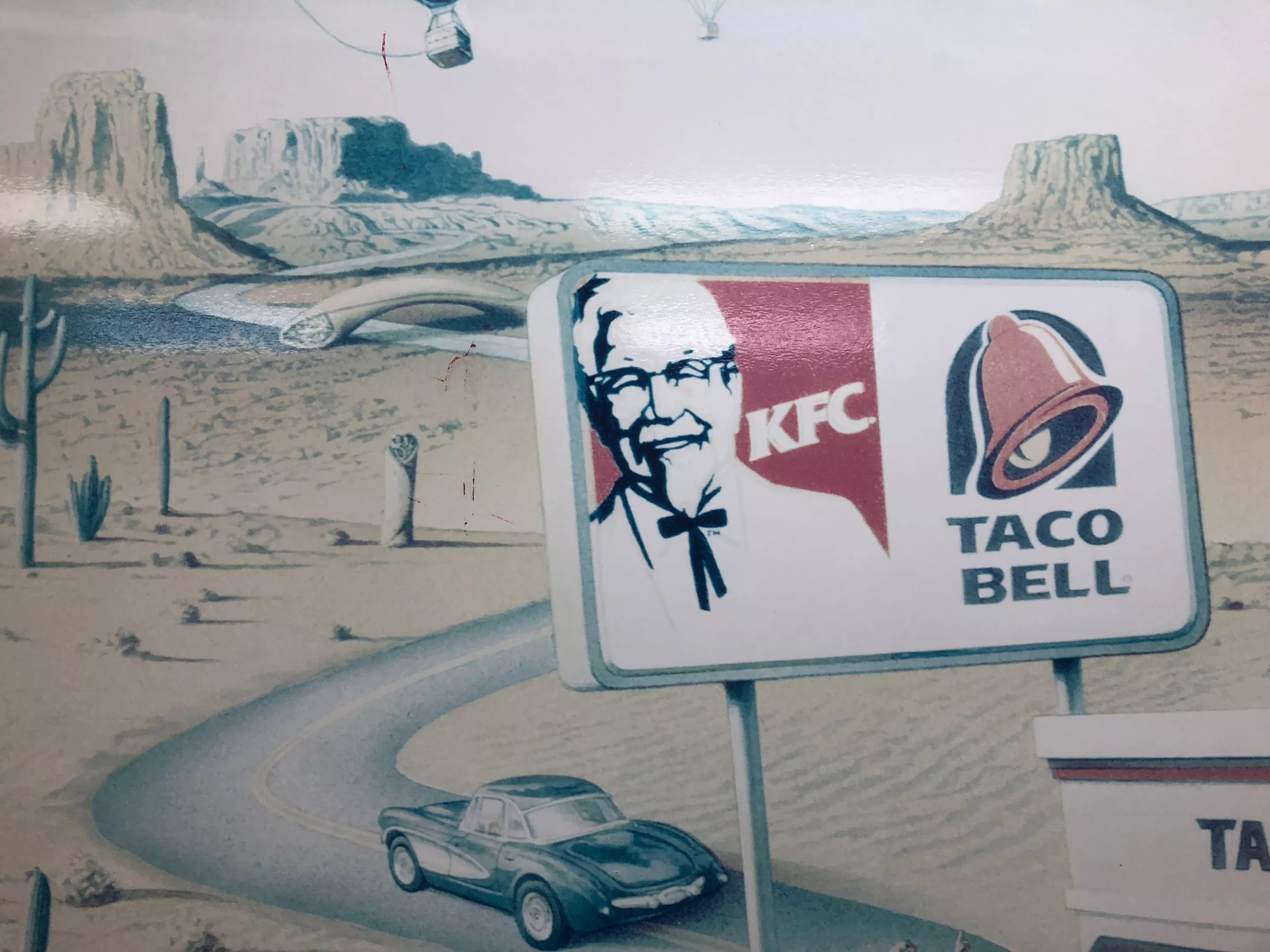 On the left, we see the Southwest – a bleak but bounteous land of cheap burritos. While Taco Bell’s first location was in the Los Angeles suburb of Downey, California, the towering buttes and saguaro cacti are reminiscent of the Sonoran Desert. On the right, the painting depicts the rolling green hills and farmhouses of Kentucky, made slightly surreal with the presence of drumstick-shaped blimps overhead.