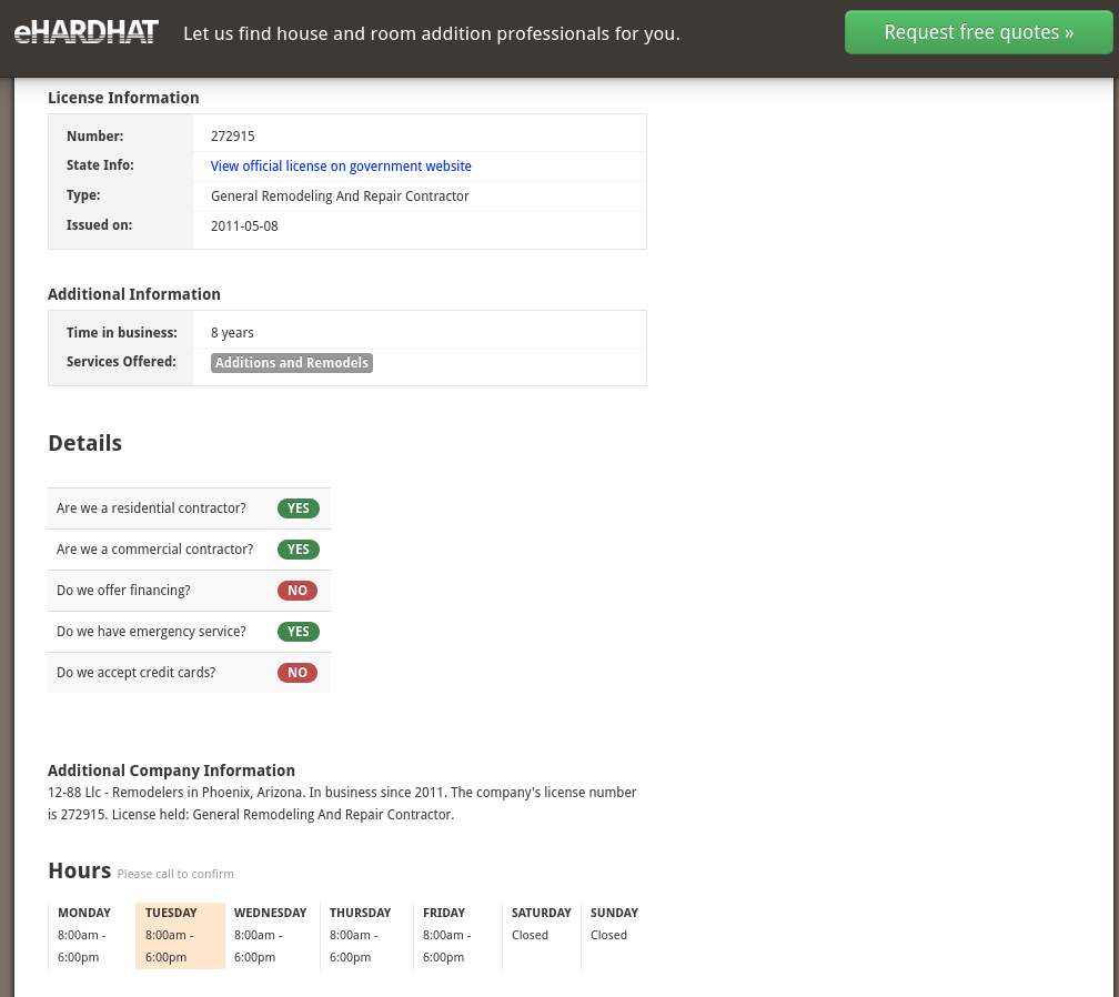 On eHardHat.com, 12-88 LLC appears to be an active, licensed company.