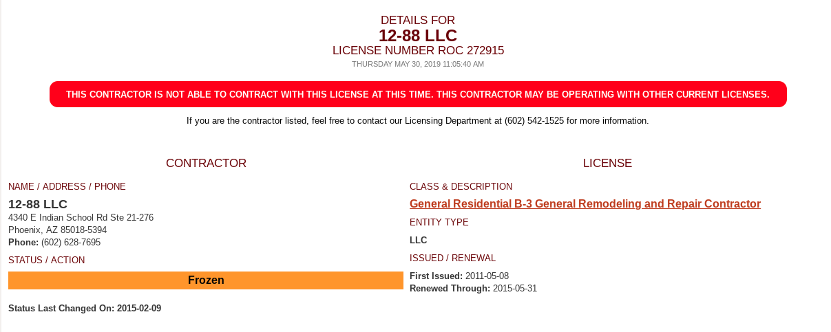 As director of the registrar, Fleetham was still advertising the services of that company, 12-88 LLC, despite the freeze on his license, the letter alleged. Under Arizona law, it’s illegal for contractors to advertise their services, never mind take work, without an active license.