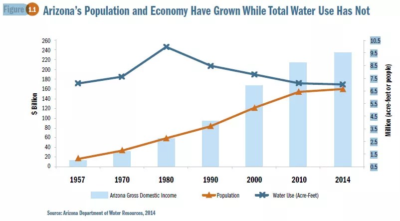 Also, consider this. Even as Arizona’s population and economy grew rapidly, water use has not. In fact, we use less water today than in 1990, even as the population doubled and the economic output tripled.