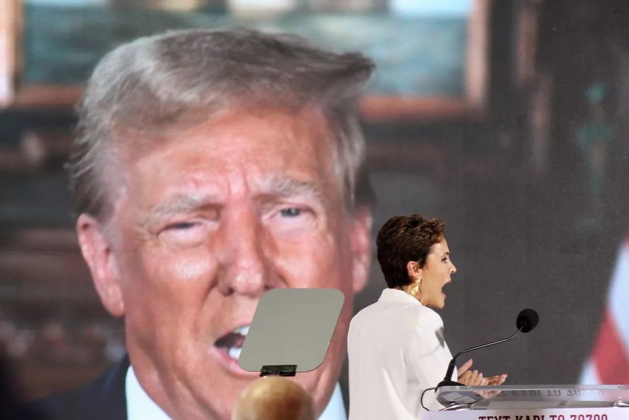 Toward the end of the speech, a comically large “Wizard of Oz”-like projection of Trump appeared behind Lake. As he endorsed her candidacy, she stood directly in front of the image to return the gaze in devotion.