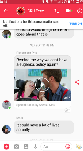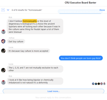 Those posts were public. He expresses even more explicitly offensive views in private, according to photos and Facebook Messenger screenshots leaked to New Times. In a statement published on its website prior to the publication of this story, CRU confirmed that its members were involved in some of the chats and photos leaked to New Times.