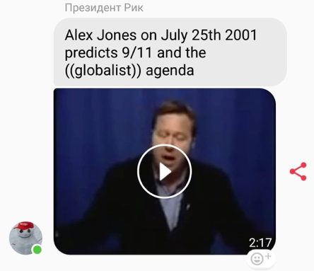 “Alex Jones on July 25th 2001 predicts 9/11 and the ((globalist)) agenda,” Thomas wrote, in an apparent reference to the anti-Semitic conspiracy theory that Jews are secret puppet-masters controlling the world.