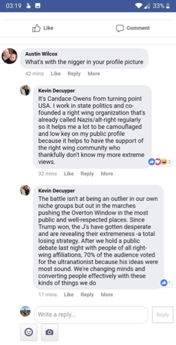 Decuyper, whose profile picture featured him and the African-American conservative commentator Candace Owens, posted in an unrelated racist Facebook group. A man named Austin Wilcox responded, “What’s with the nigger in your profile picture.”