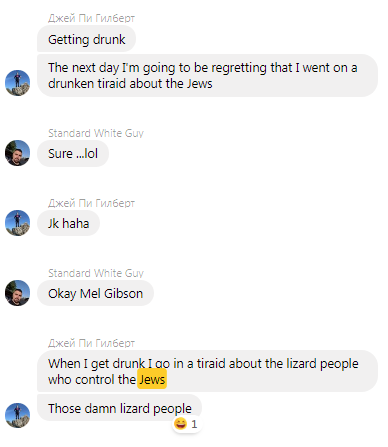 In the screenshot of Gilbert’s chat, he can be seen saying, “When I get drunk I go in a tiraid [sic] about the lizard people who control the Jews.” Gilbert appears to be referencing a conspiracy theory claiming that many world leaders are actually reptilians who can morph into humanoids.