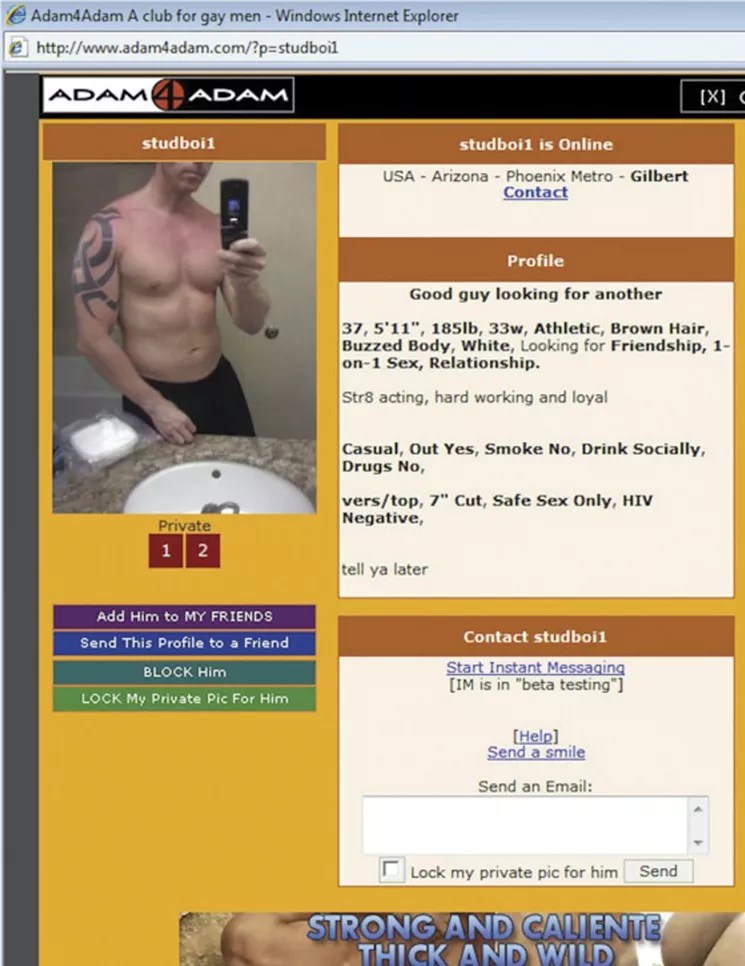 Although, Babeu may have been thinking with another part of his anatomy at the time. Babeu’s a horny guy. Witness the profile he had on the pornographic gay pickup site Adam4Adam.com, under his handle studboi1, with half-naked pics of himself and a description of his penis – “7”, cut.”