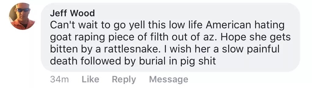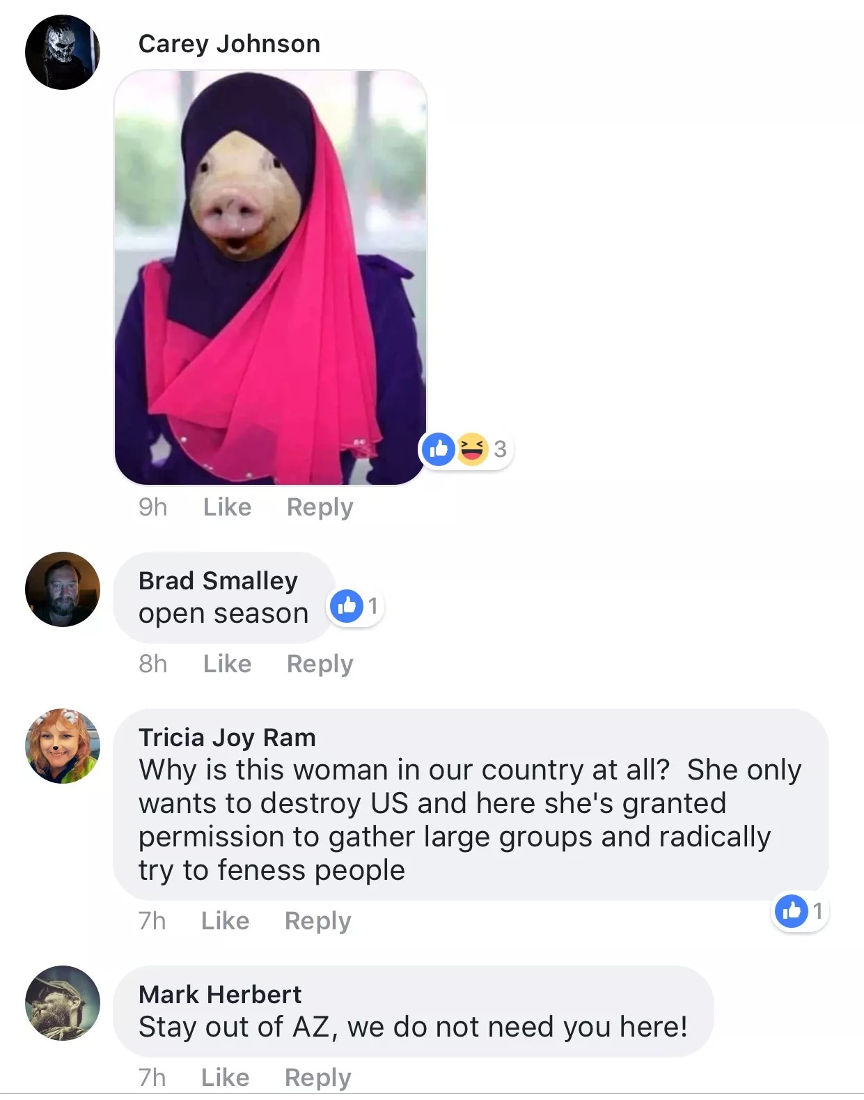 Some of the comments that he’s deleted are just stupid and offensive (for instance, a photoshopped pig wearing a hijab.) Others cross the line into sounding more like a direct threat – such as the commenter who wrote, “I wish her a slow painful death.”