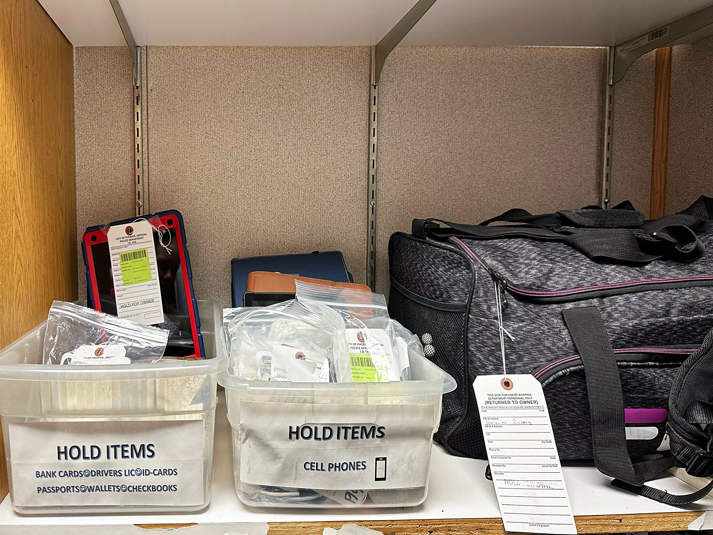 After that time, everyday articles such as clothing, headphones and shoes are donated. Currently, the airport works with Habitat for Humanity. High-dollar items, such as computers, phones, fine jewelry and cash amounts greater than $200, as well as weapons, are handed over to Phoenix police.