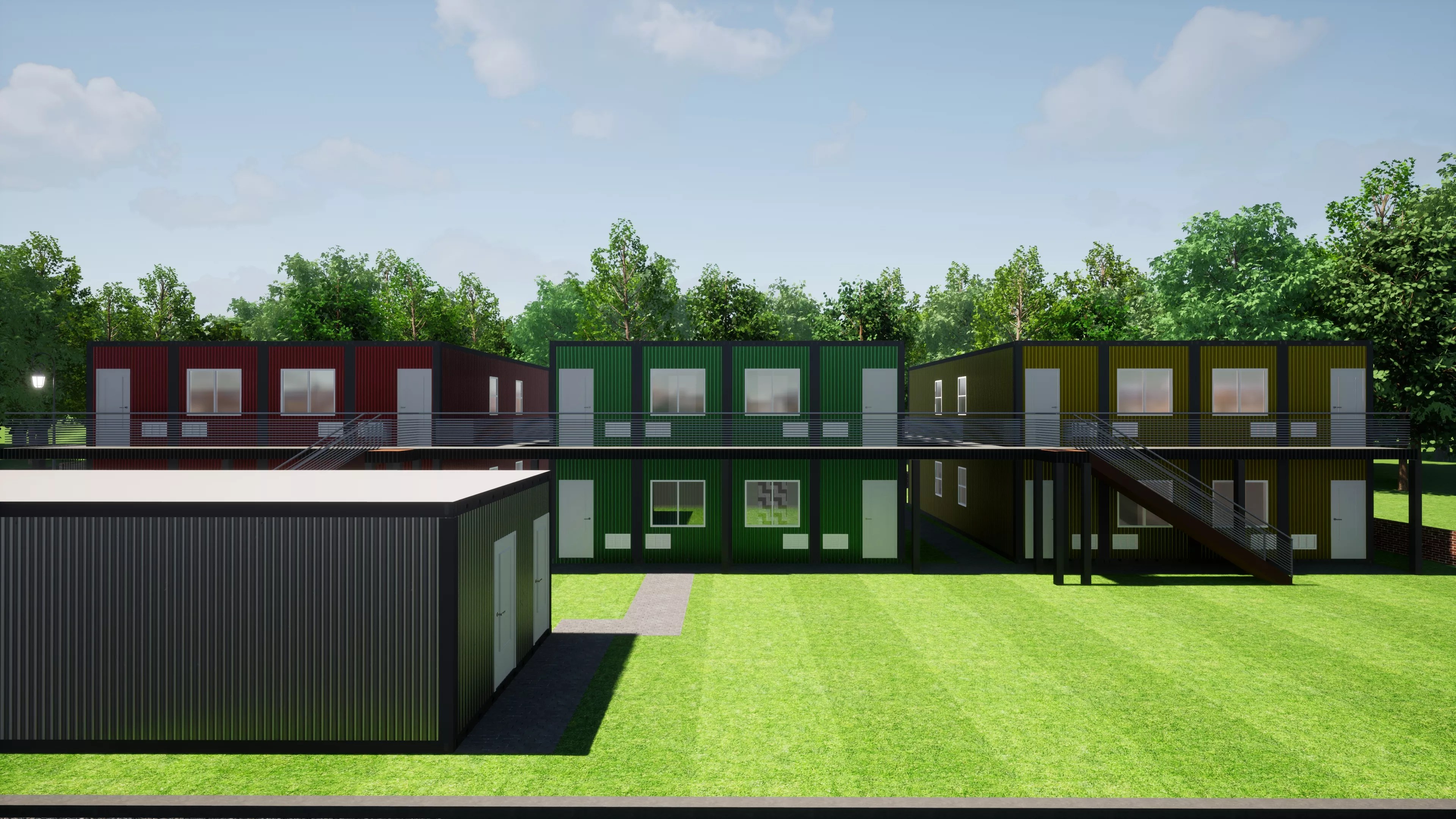 “So this will be a downstairs unit, and it’s made out of four 40-foot long by 8-foot wide shipping containers,” said Josh Bleak, co-founder of the construction company. “There will be four apartment units on each floor; each unit will be 320 square feet.”