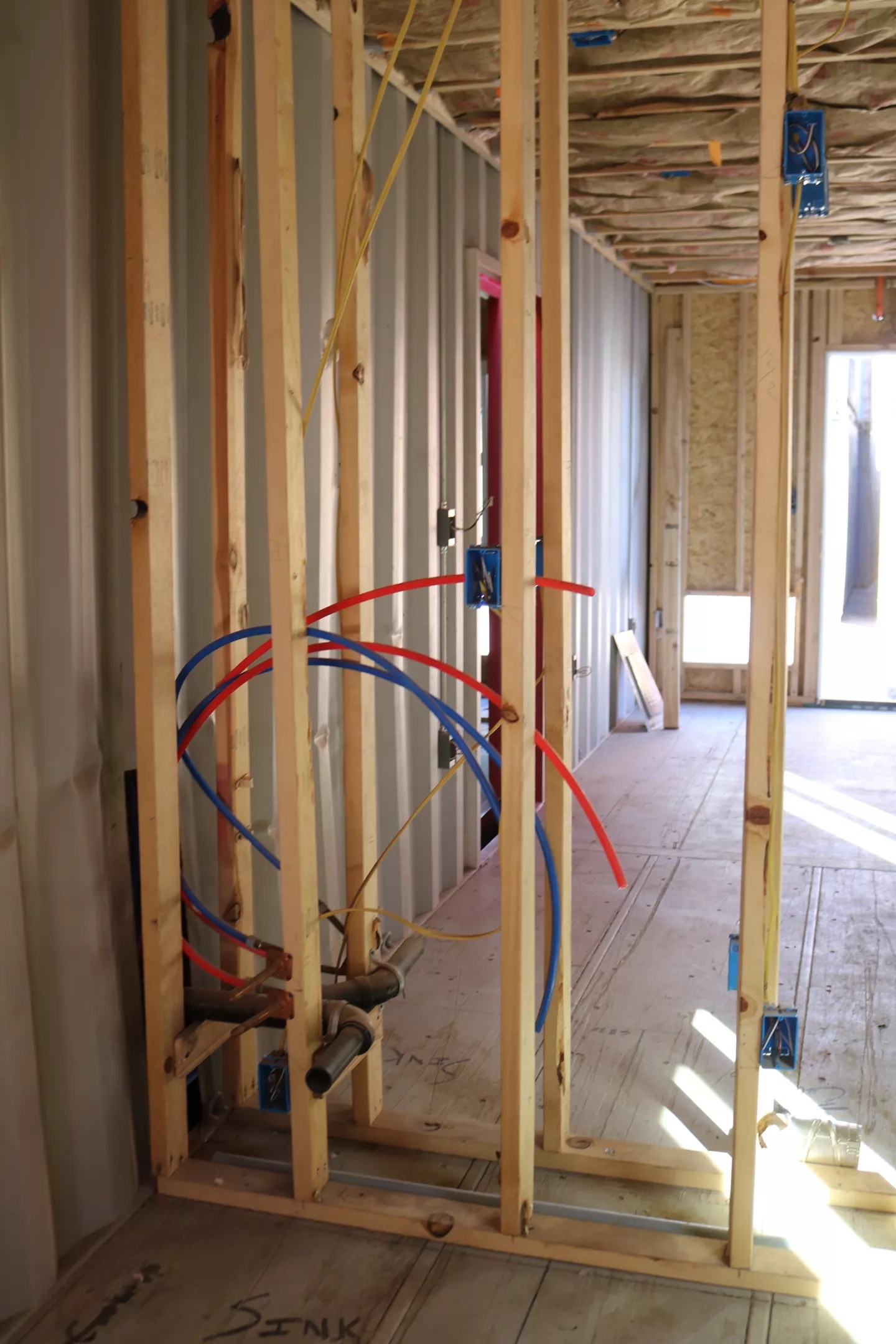 Next, electricians routed the wires from behind the front doors where the panel boards will be mounted, then along with the underbellies of the drywall and ceilings. Next, plumbers laid the piping, and Contractor Fire Protection & Backflow Services from Mesa installed the fire sprinkler system. Additionally, each apartment will have an air condition unit which the team will install on-site.