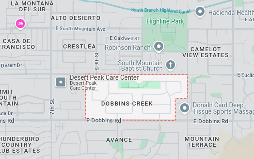 This neighborhood is in South Phoenix near the base of South Mountain. It has a community park and is near the South Mountain Baptist Church and Highland Park.