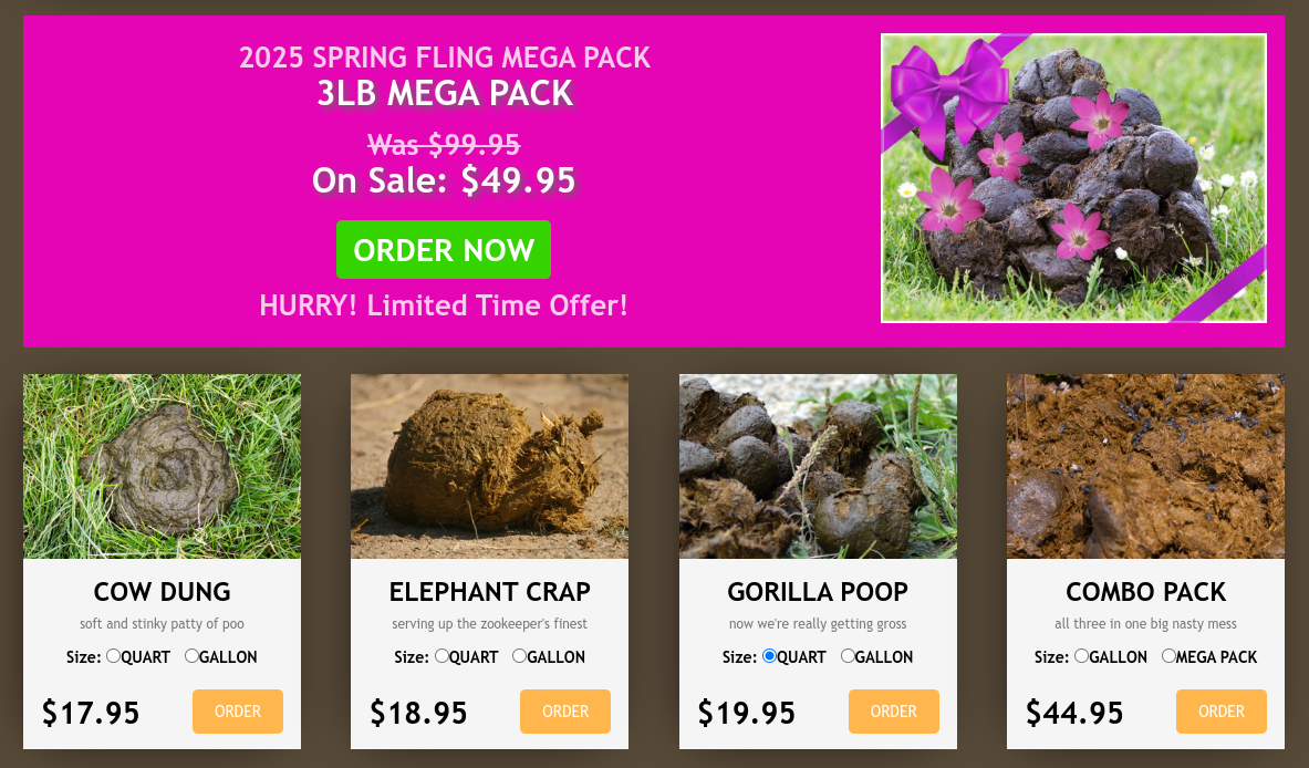 As Mitchell told police, pranksters can choose “cow dung,” “elephant crap,” “gorilla poop” or the “combo pack,” described as “all three in one big nasty mess.” But the authenticity of the goods may be suspect, given a statement on the company’s FAQ page about whether its shit is real.
