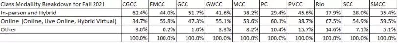 (See below for the chart with all of the colleges’ Fall 2021 modalities and their percentages.)