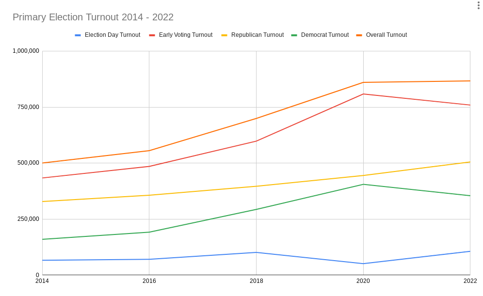 The trend continued in 2020, which saw an increase of more than 160,000 voters over 2018. The 2022 primary, which set a slate of Democratic candidates who went on to wins in November, drew 6,000 more voters than the previous cycle. That was the smallest year-to-year jump in the last decade, so it’s possible that turnout will plateau this year.