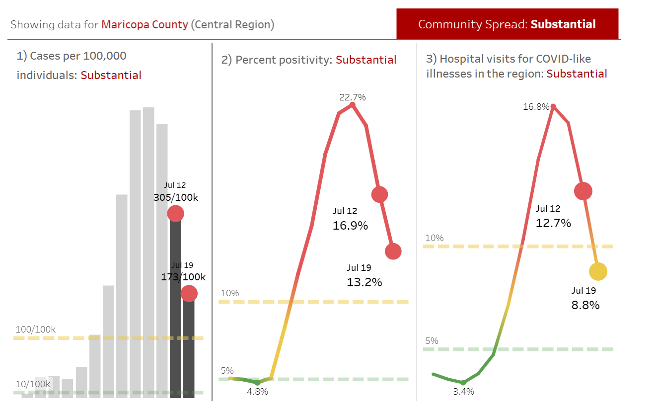 As with schools, the DHS is offering a dashboard on its website that will provide information on the status of each county. Maricopa County is still in the “substantial” phase for all three metrics, but is trending downward. Christ said she expects the county to reach the “moderate” phase within the next few weeks “if the trends continue the way they are.”