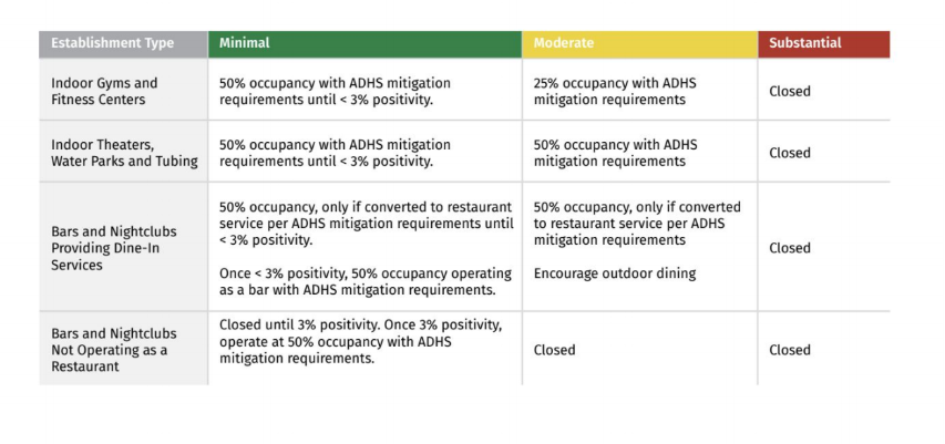 Even once spread is minimal, bars will not be allowed to reopen until only 3 percent of COVID-19 tests in the county are positive, and even then, can only do so at 50 percent capacity. Arizona DHS head Dr. Cara Christ said this will likely remain the case until a vaccine or other measure changes the situation, calling them a high risk for transmission.