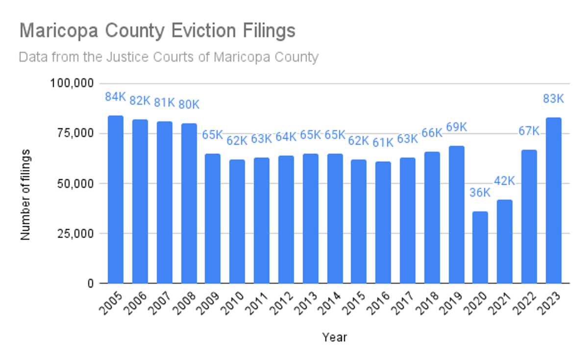 Maricopa County currently averages 7,334 filings a month, nearly 400 more than the 2005 monthly average of 6,974 filings. That’s an increase of 5%. There have been 73,339 evictions filed this year.