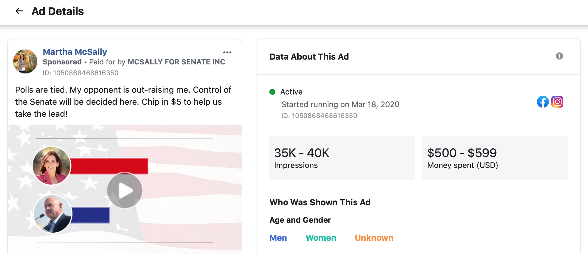 The Facebook ads launched even as McSally announced that she had directed her campaign to “cease all television political advertising for at least the next 30 days.”